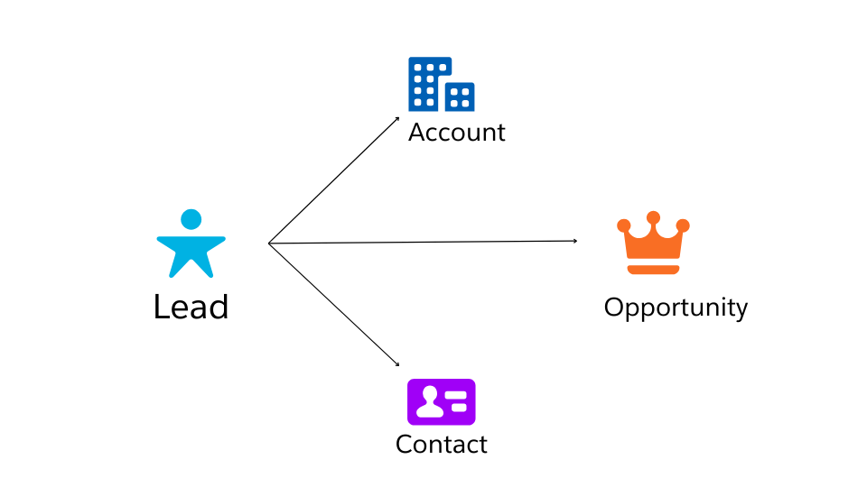 Salesforce uses the lead’s data to build a new account and contact record when the lead is converted. An opportunity record is optionally created as well. The new opportunity, contact, and account records are connected to the converted lead record.