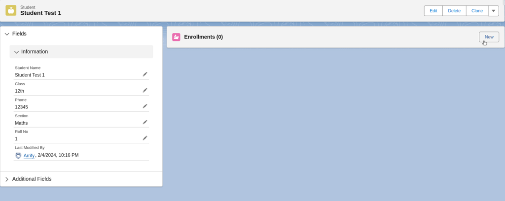 - Create an enrollment record (the junction object record) by clicking “New” and associating it with the student record and a course record.