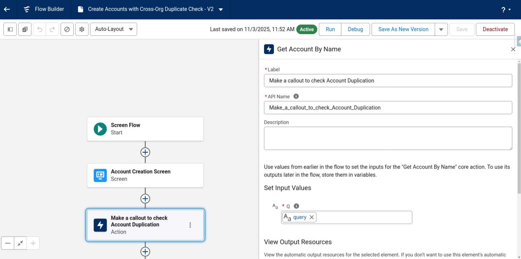 Click Save → name it:Create Accounts with Cross-Org Duplicate Check.