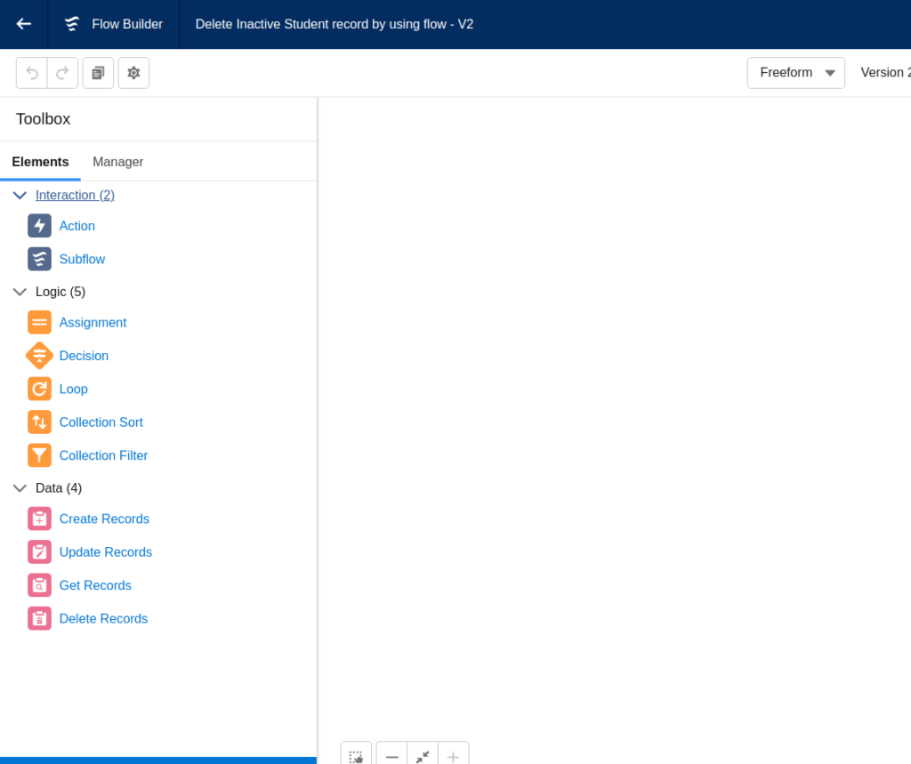 Next, you have the Elements tab. In the below image, you can see Interaction, Logic, and Data Elements. These are showing dynamically depending on the type of your Flow.