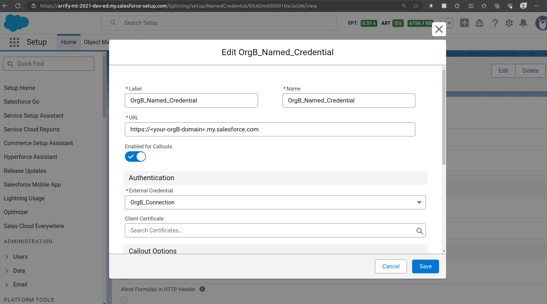 We’ll create a Named Credential in Org A (Sales Org) that stores the details of how to connect to Org B (Support Org) (which is already exposed via the Connected App).