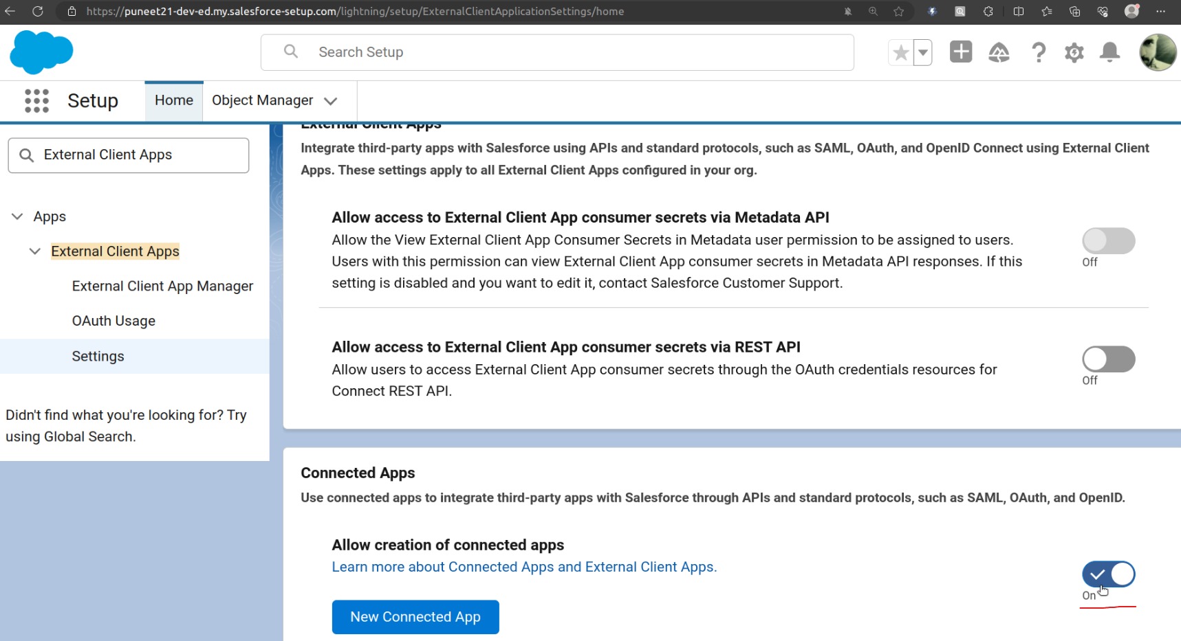In Org B (puneet21)-> Turn on “Allow creation of connected apps“.
